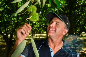 (BAYLISS) Stanley - Nightingale Orchards, Stanley. Richard Guthrie, the manager of Nighingale Orchards with the soon to be harversted Chestnuts.